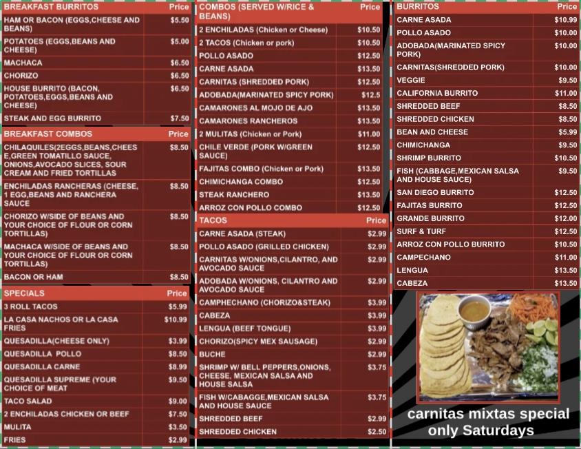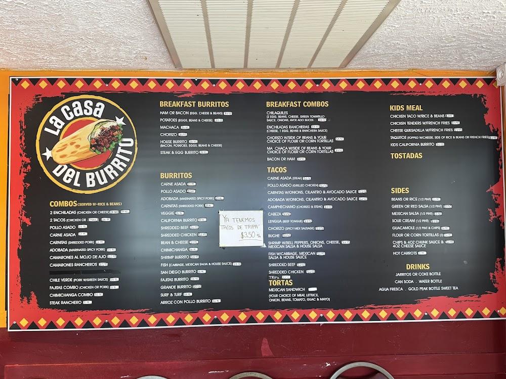 La Casa Del Burrito Taco Shop boasts a diverse menu inspired by traditional Mexican fare. Breakfast burritos, tacos, and combos take center stage. The menu includes flavorful options like ham, steak, and egg burritos. Prices are generally accessible, averaging around $4.75.